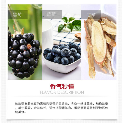 有丰富的黑莓和蓝莓的果香味,夹杂一丝甘草味,结构均衡,单宁柔软,余味悠长。