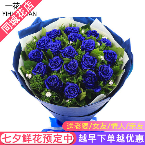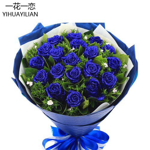 稀有的蓝色妖姬花束,清新脱俗,寓意清纯的爱,送礼表白皆宜。搭配同色系卷纸和蝴蝶,高雅贵气。