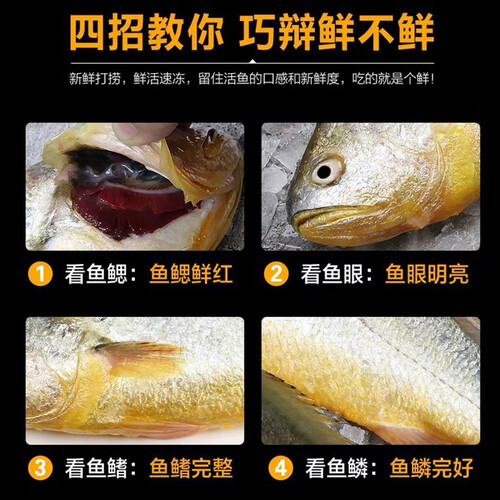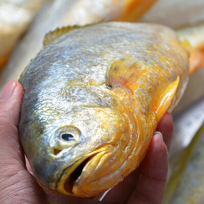 自家渔船每日出海捕捞,出海后急速冷冻,新鲜发出,品尝鲜美原味。大黄花鱼鱼鳃鲜红,鱼眼明亮,每条至少有30cm长。