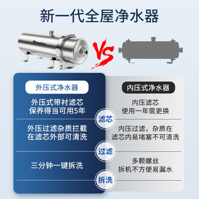 采用外压过滤的设计,能将泥沙、微生物全部拦截在外,避免出现滤芯堵塞的情况。过滤精细,可去除水中有害物质,保留有益元素。