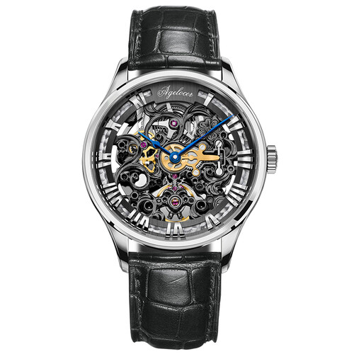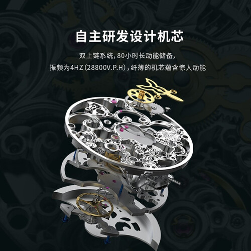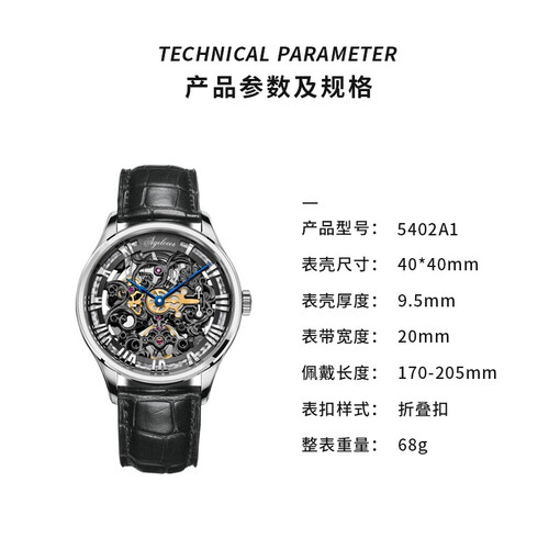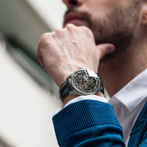 镂空的机械机芯加上精致的流云雕花,创造不一样的通透机械美。压纹牛皮结合德国车线工艺和手工包边,经久耐用。