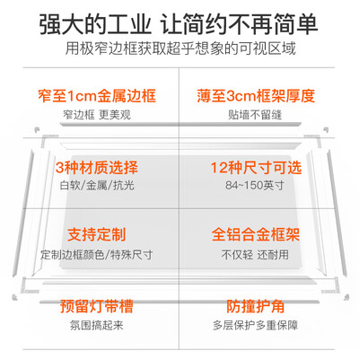 采用超窄的黑边框设计,获取超乎想象的视觉区域。高清PVC材质幕布,带来鲜活生动的高清画质,画面细腻有层次,提升观影体验。