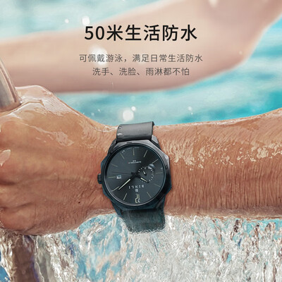 含氟原子的橡胶表带,亲肤耐磨,日常打理方便。人工合成的蓝宝石表镜,明亮通透,长时间佩戴无易刮花。