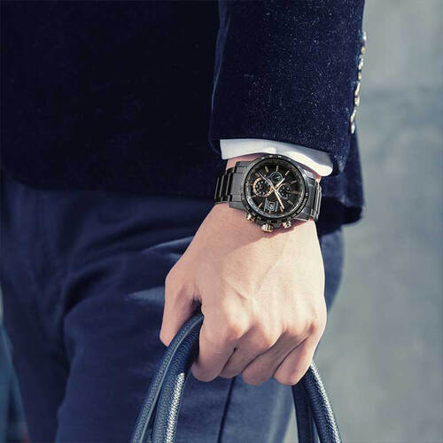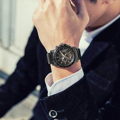 炫酷风格设计,黑金撞色,营造生动强烈的视觉冲击,佩戴起来个性十足。三眼大圆盘,多功能计时,时间读取也清晰直观。