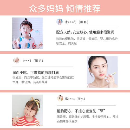 添加各种果油以及天然的蜂蜡成分,能够给宝宝的嘴唇滋润呵护。成分天然没有任何添加,宝宝舔嘴也不怕。