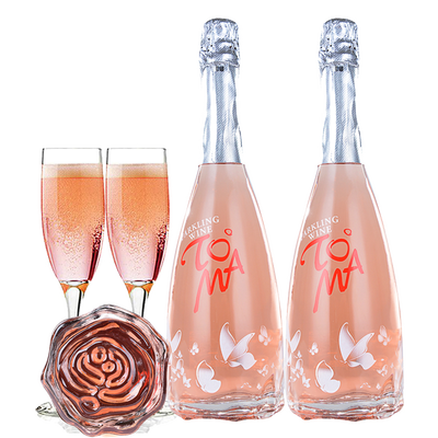 入口有水蜜桃、草莓和荔枝的水果口味,收尾时带有淡淡的玫瑰花香,是这款起泡酒的特点,酒体呈粉橘色,口感清爽甘甜。