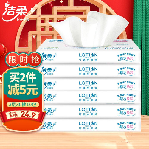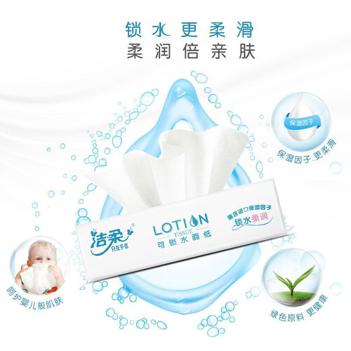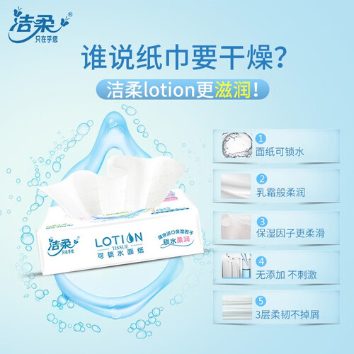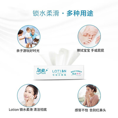 特别添加了保湿成分,柔滑健康锁住水分,呵护娇嫩肌肤。厚实3层设计,触感柔韧舒适,不掉落纸屑用途广泛。