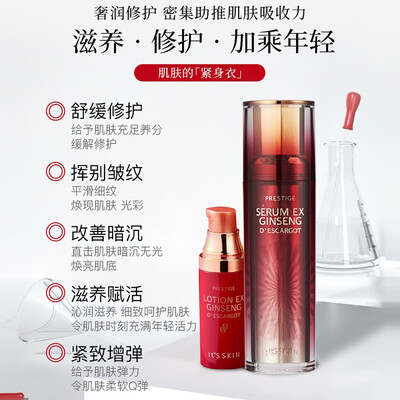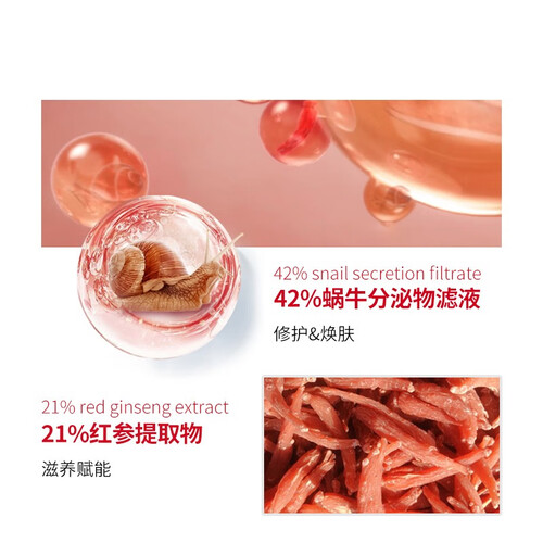 包含六年红参精华,内含丰富营养物质,可令肌肤状态更加健康。包含蜗牛提取物,增强肌肤保湿力,肤感持久水润。