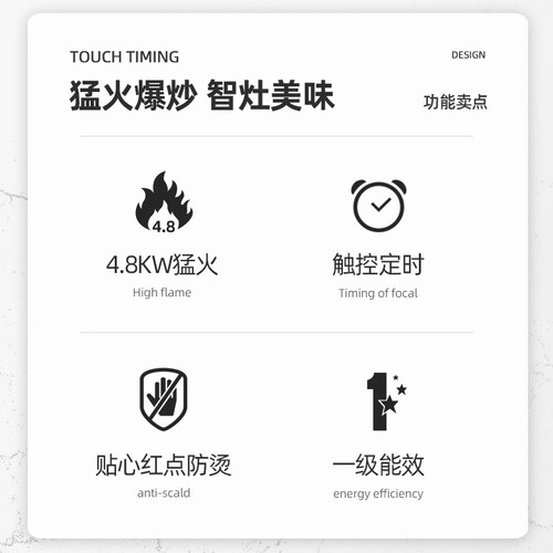 贴心的防烫温变提醒功能,安心烹饪不担忧,并且还有4.8KW猛火定时功能,烹调无需看管,给你更自在的烹饪体验。