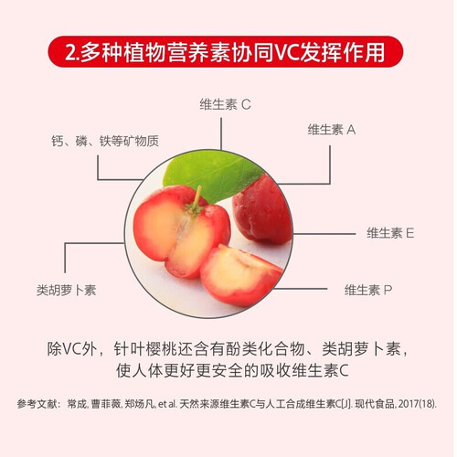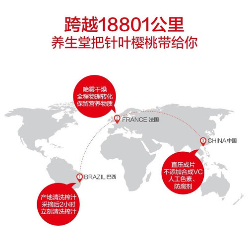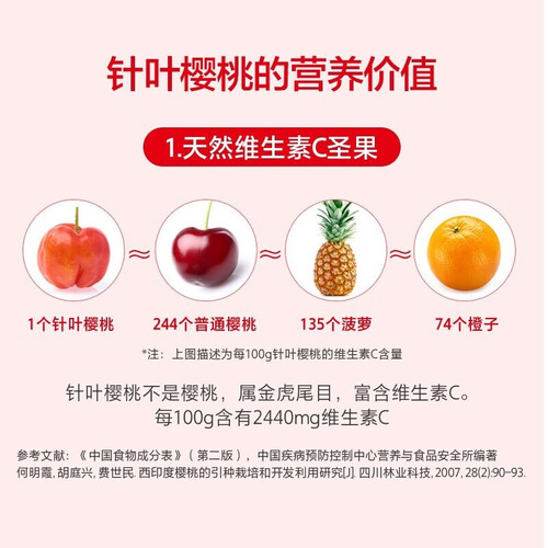 产品选用巴西针叶樱桃为主材进行制作,其原材中含有丰富的活性营养物质,增强人体抵抗力,促使免疫调节能力更佳。