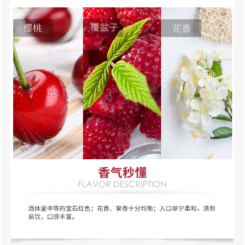 中酸度的葡萄酒,入口微酸,随后甜味慢慢释放,刺激你的味蕾。均衡的果香和花香,口感丰富,清新易饮,入口单宁柔和。