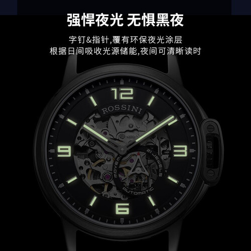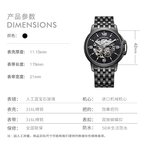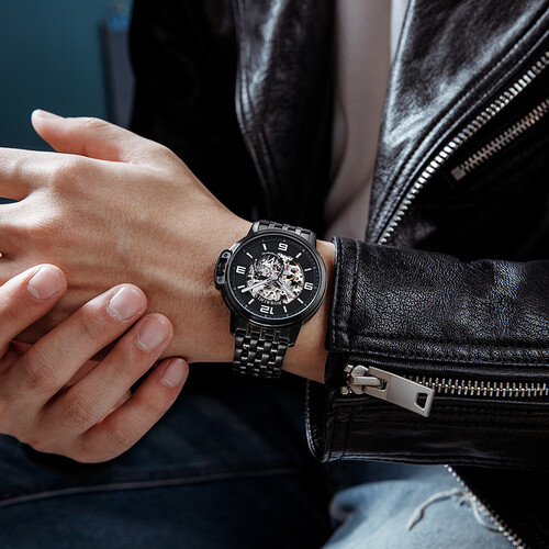 全镂空盘面设计,更好的洞察机芯运转,尽显深邃质感。实心精钢表带,防磨耐刮,厚实有分量,充满质感。