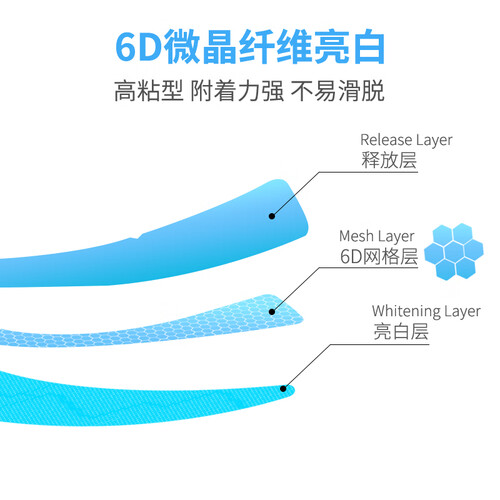 温和活性氧,去渍亮白不伤牙。6D微晶纤维,紧锁亮白成分。舒适便捷,自然轻薄。蕴含椰子油精华,呵护牙釉质,亮白牙齿。