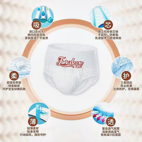 360°环形腰围设计,穿着方便省力,三重立体防漏隔边有效阻隔尿液侧漏。芯体吸力强劲,不起团不断层。