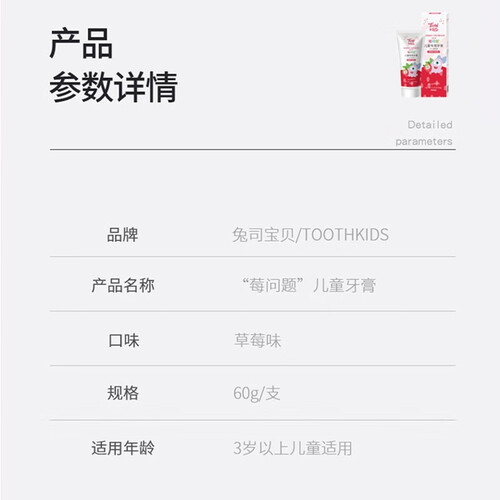 采用安全无氟配方,不会对宝宝牙龈造成刺激,呵护宝宝娇嫩口腔。散发香甜草莓气息,让宝宝喜欢刷牙。