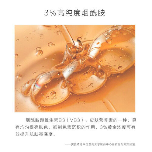 蕴含有3%的高纯度烟酰胺成分,为肌肤补充能量和营养的同时,还能提亮和均匀肤色。融合多种植物精粹成分,温和不刺激。