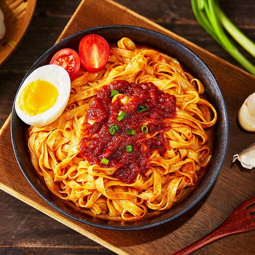 甄选小麦制作的面条,经过高温熟化后更健康。里面加入牛肉精华,黄豆酱、辣椒粉、芝麻进行调味,酱汁香浓扑鼻,嚼起来劲道有味。