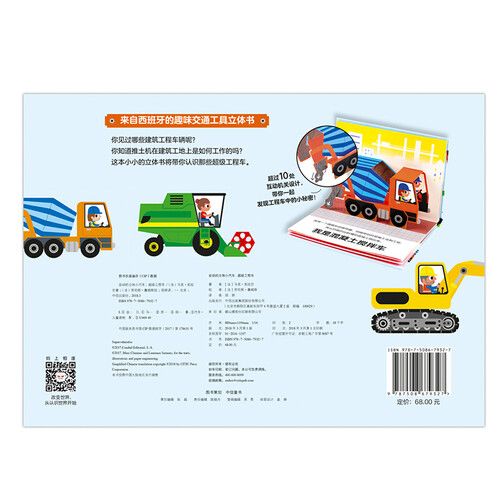 以图画的形式向孩子们展现了拖拉机、收割机、推土机等工程车的外观,激发孩子的阅读兴趣,帮助孩子了解交通工具的机械原理。