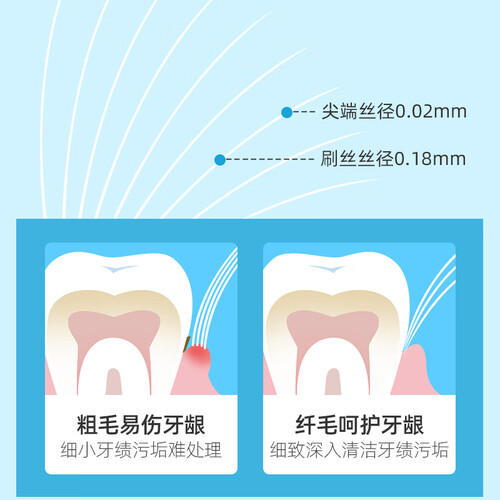 植毛工艺制作,持久耐用不易掉毛,延长使用寿命。柔软的丝毛,能够深入牙缝,清洁较难清理的死角,减少牙菌斑滋生。