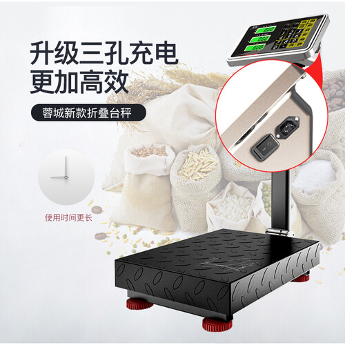采用三孔充电设计,稳定输入电量,节省更多时间。高强度碳钢架,结合防滑花纹钢板秤盘,坚固耐用,放心称重大件货品。