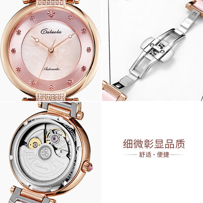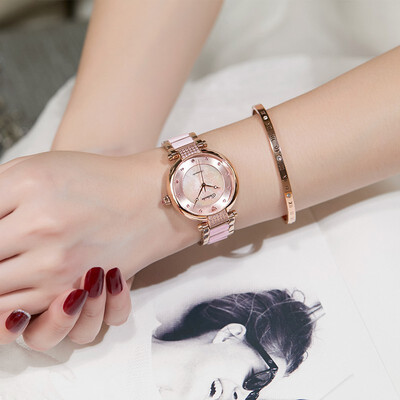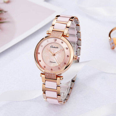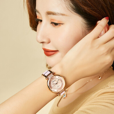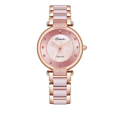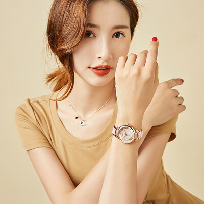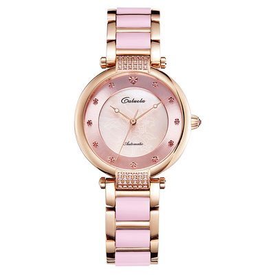 粉色的盘面以及粉色的陶瓷表带,融为一体,展现浪漫甜美的风格,盘面采用锆石的刻度,轻奢耀眼,还有花型纹理。