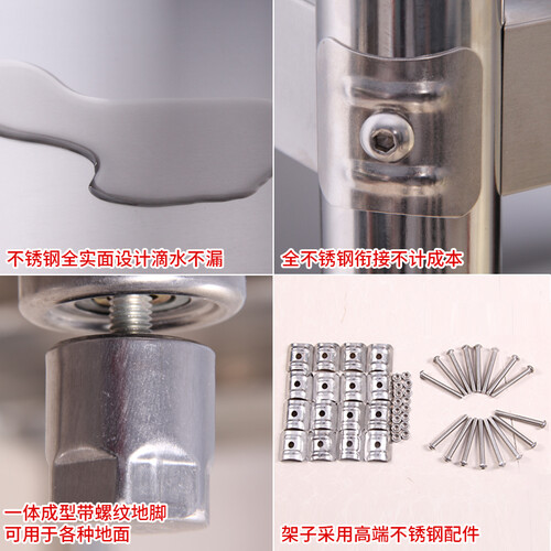 不锈钢全实面架身,不易生锈破损,滴水不漏易清洗;一体成型的带螺纹地脚,能轻松适应各种地面,底座稳才能不晃动。