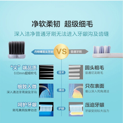 宽头牙刷的设计,可以增加与牙齿之间的接触面积,刷牙效率更高;黑白两种刷毛交叉分布,可以对牙龈进行针对性清洁。