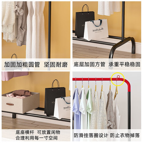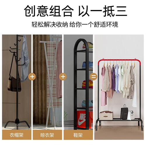 采用晾衣架、衣帽架和置物架三合一设计,能有效利用空间收纳;衣杆采用加粗加厚钢管,承重能力强,长久使用不易生锈。