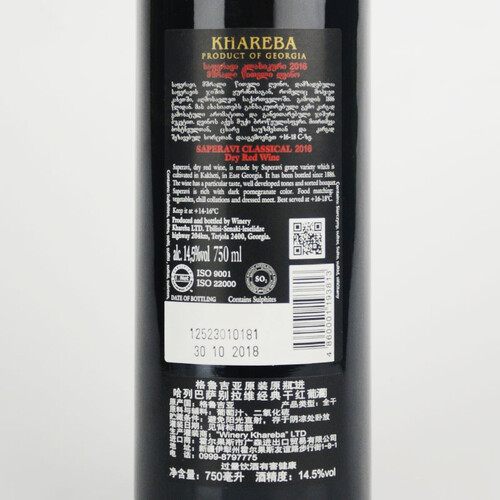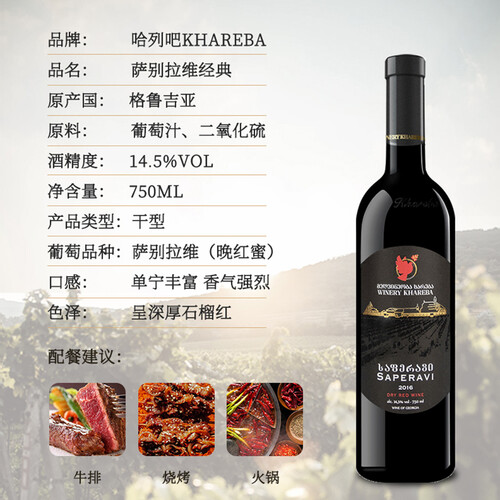 选用皮薄色深的萨别拉维葡萄酿造,成就了红酒的浓郁色泽和馥郁口感。丰富的单宁含量,入口的口感层次分明,余味悠长。