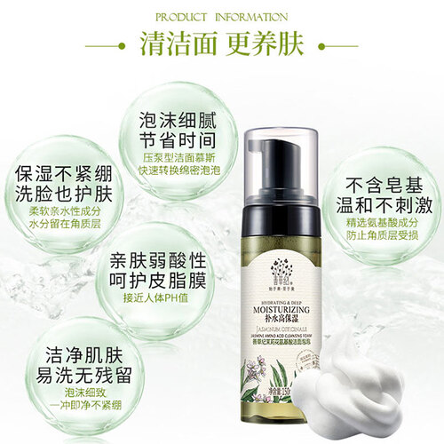 拥有绵密泡沫,上脸温和不紧绷,可深层浸透毛孔的污垢。萃取茉莉花精油成分,直到肌肤吸收,补水保湿。协同玻尿酸钠,锁住水分。
