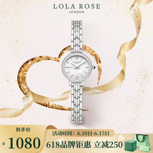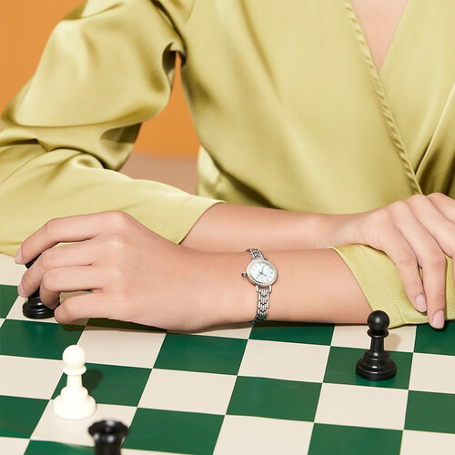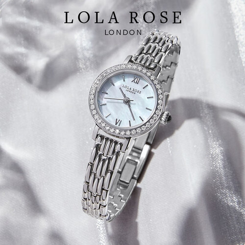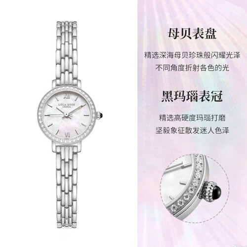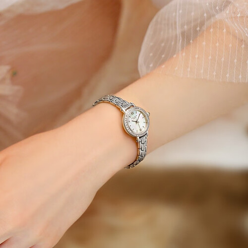 白色贝母表盘,表圈镶钻点缀,blingbling的,十分闪耀迷人。搭配银色精钢表带,风格华丽浪漫,轻松衬显出优雅气质。