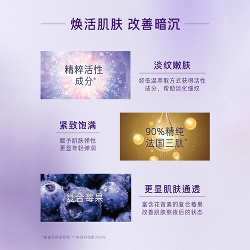 选用低温萃取方式,富含活性能量元,击退初期细纹。配合花青素原材,肌肤保鲜力更足,让熬夜党不再暗沉。