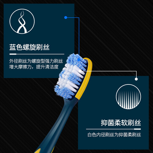 采用进口螺旋刷丝,能够深入牙缝清除残渣污垢,让口腔环境更卫生;运用双重制毛科技,刷毛不易脱落;防滑手柄,手感舒适又安心。