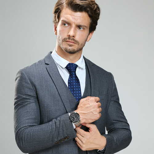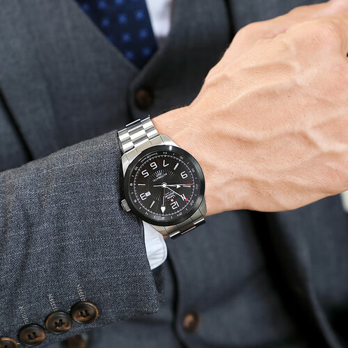搭载多时区机械机芯,适合经常出差的人群使用。45mm的大表盘设计,再加上立体的剑型指针,看起来帅气独特。