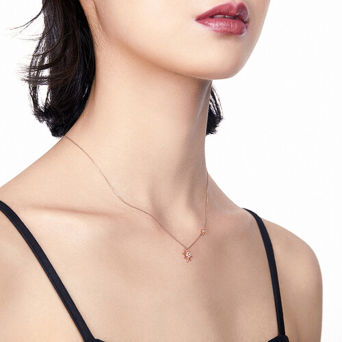 简约小光芒造型,不对称设计,时尚有个性。18K玫瑰金衬托出钻石的闪耀。品牌LOGO尾链,细节感满满。