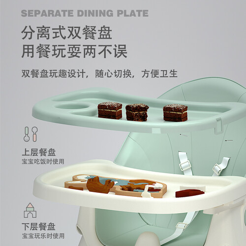 双层结构餐盘,轻松即可拆卸,方便餐盘清洗。仿金字塔结构椅身设计,呈现三角形般的高度稳固,有效防止冲撞倾倒。