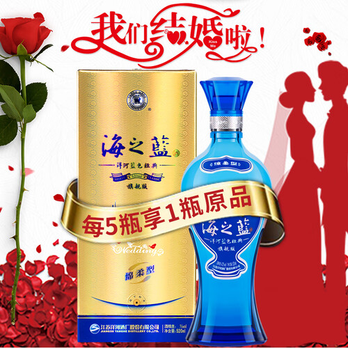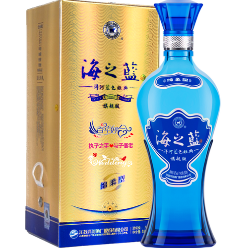 婚礼定制白酒,口口留香的甘醇,给你想要的甜蜜。独特海洋蓝色的瓶身设计,更显浪漫气息,清冽醇香,绵柔悠长。