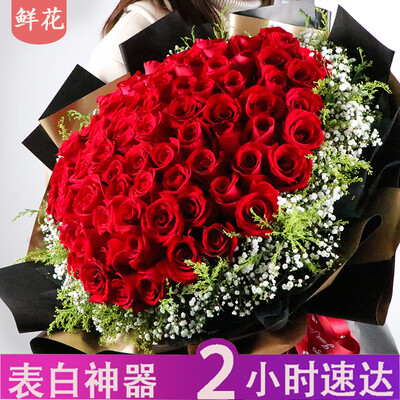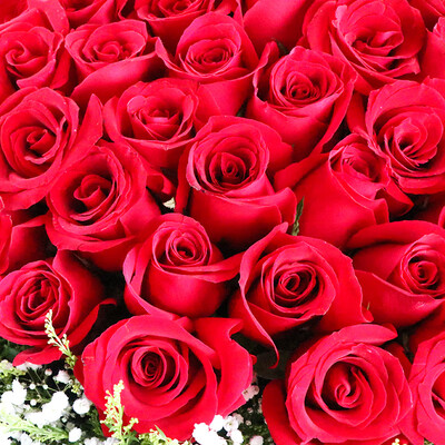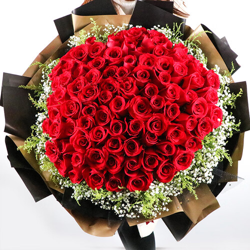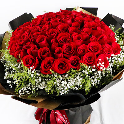 红艳的99朵玫瑰花抒写永远爱你的美好诗篇,花朵大且饱满,盛放的姿态娇艳欲滴;搭配黑色包装纸和白色满天星更显火红激情。