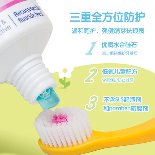 配备符合各年龄层儿童的安全含氟量,刷牙时给予牙齿一层防护膜,可以避免牙齿受到侵蚀。清新草莓口味,让宝宝更加喜爱。
