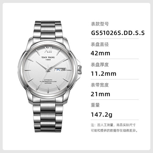 天王 双历商务钢带手表