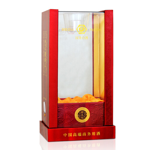 八棱井口造型的瓶颈锁扣,大红色的瓶身,井与鼎的瓶身造型,小面黄色装饰,整体外观方圆有度,更显端庄大气。