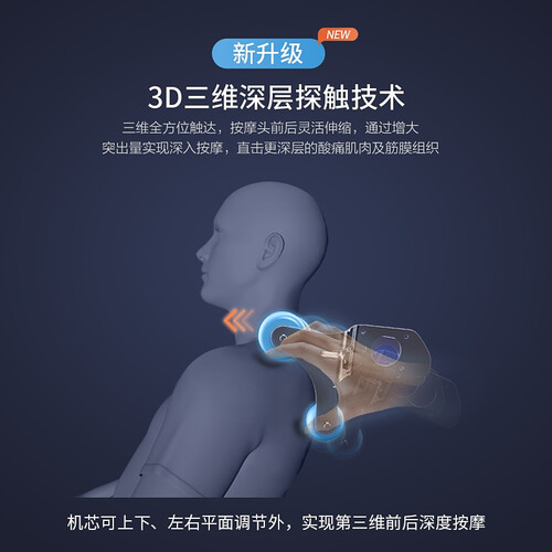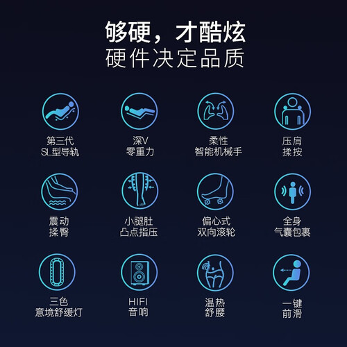 全行程SL型曲轨,128厘米长度,完美贴合人体曲线。柔性摆臂机械手,立体覆盖整个背部。高品质环绕音响,让你在音乐中放松。