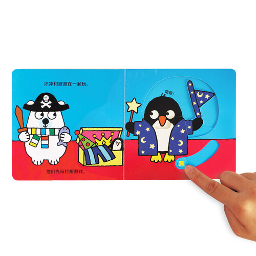 冰冰和波波是企鹅和北极熊,宝宝只要拨动滑块机关,就可以跟随着小企鹅和小北极熊一起玩耍,促进手脑发育,提升环境保护意识。