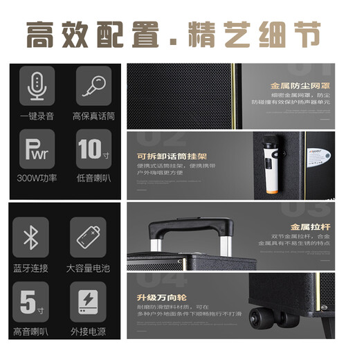 操作简单明了并且底部有轮子、侧面拉手。350W峰值音量,穿透力强劲,给您强劲震撼音效。大功率音箱,很适用做跳舞。