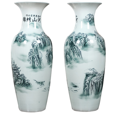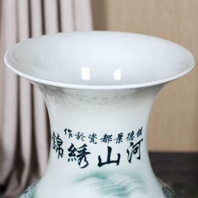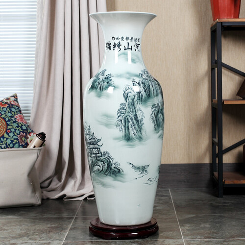落地式大花瓶,大气磅礴。光滑平整的瓶口结合线条流畅的瓶身,让人看了赏心悦目。山河画的装饰,简约大气。