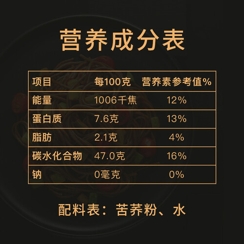 纯苦荞和水的单一配方,结合匠心技术制作而成,入口不会苦涩。急速冷冻更好锁住面条的新鲜,提升口感。