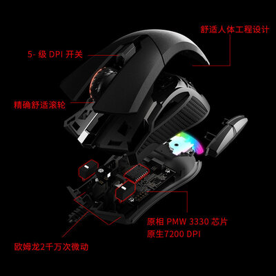 内置原相PMW3330电竞级光学传感器,具备精确的定位能力,还设有DPI键调整快捷按键,随心切换。
