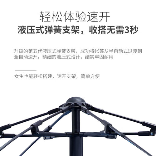 采用弹压式开合系统,能够实现速开效果,一人即可轻松完成;立体式通风结构,可保持空气对流,帐内舒适不闷热。