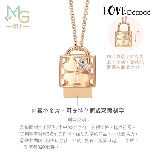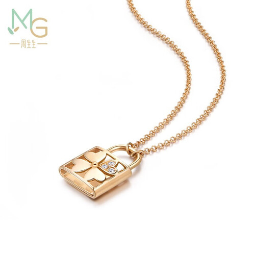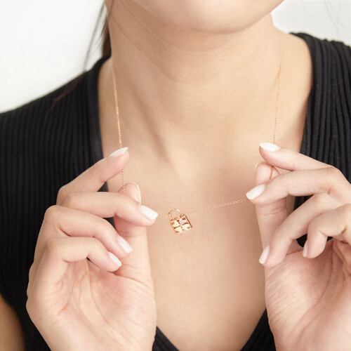 时尚的锁头吊坠,中间缀有镂空四叶草,款式浪漫精致。加以三颗钻石点缀其中,闪耀动人,佩戴于颈间,更添迷人魅力。