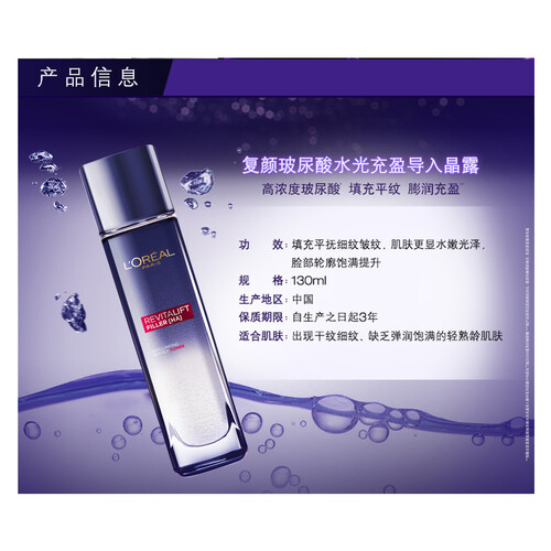 富含高浓度玻尿酸成分,质地清爽滋润,能有效填充抚平细纹,提升脸部轮廓更显饱满,让肌肤更加水嫩,后续护肤更简单。